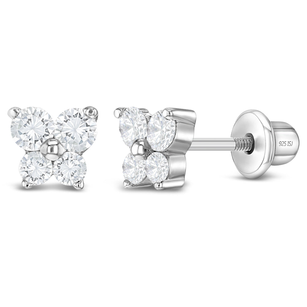 Dazzling 5mm cubic zirconia earrings for toddlers and little girls! The perfect size for all ages, these butterfly earrings for kids are crafted in 925 sterling silver and use first quality CZ stones. These hypoallergenic girl's earrings are completely safe for children with sensitive skin. The posts are threaded and feature a safety back system to ensure your child's earrings stay comfortably in place. These toddler & young girl earrings make a perfect gift for any occasion as well as for everyday fashion. A complimentary gift box is included for easy giving!
