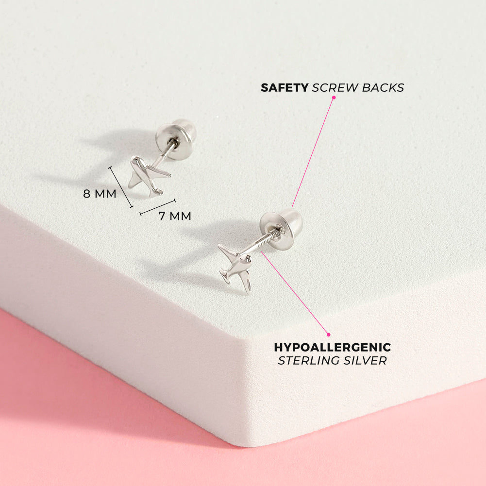 Take your little one's style to new heights with these adorable small airplane earrings! Crafted from polished 925 sterling silver, a hypoallergenic material for sensitive ears, these charming earrings feature a cute airplane design that any young aviation enthusiast will love. Designed with safety in mind, they come with secure screw back closures, ensuring a comfortable and reliable fit. For everyday wear or special occasions, these delightful airplane earrings are a fun accessory that will inspire dreams of adventure and travel!